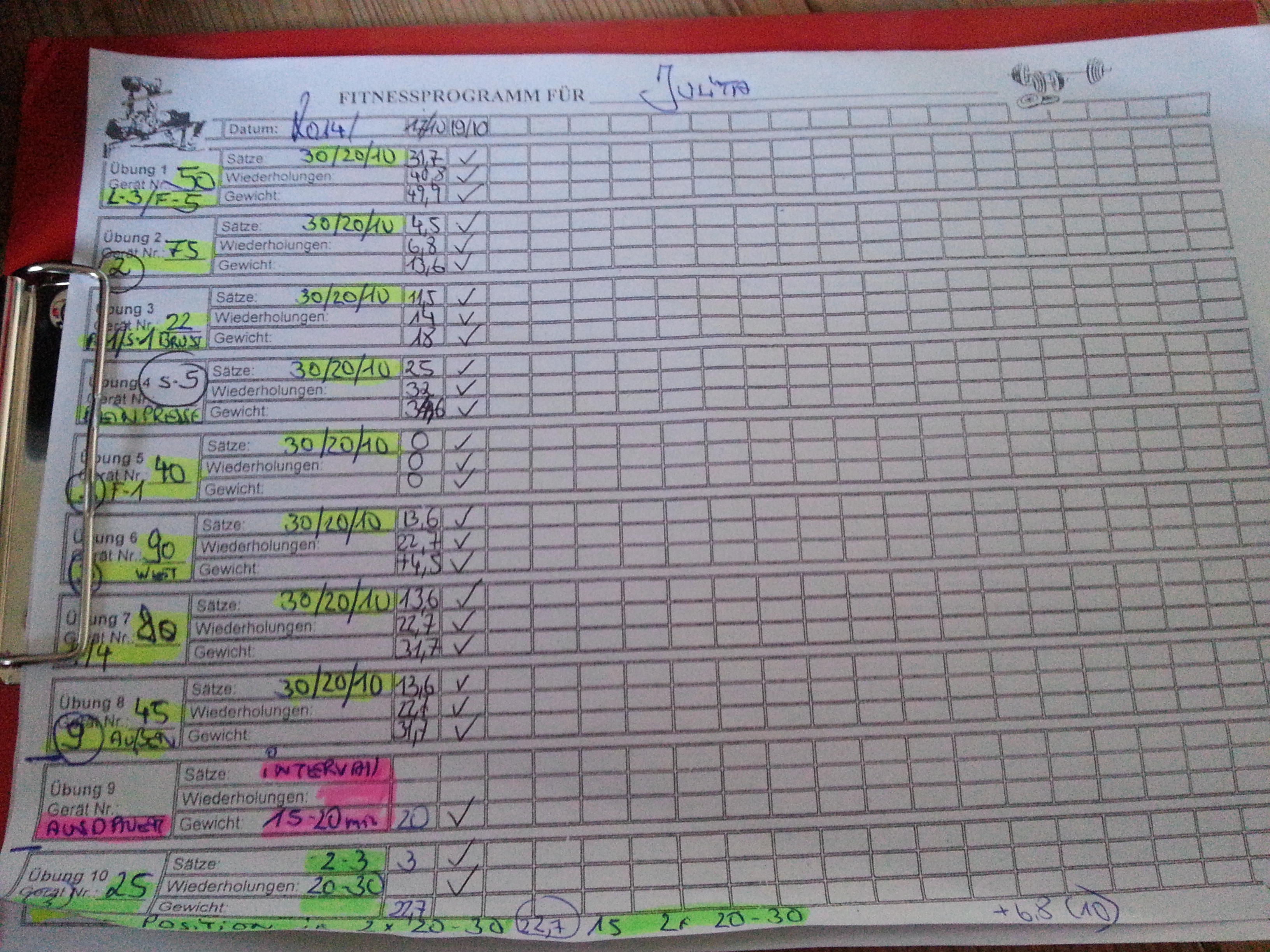 Ich fuhr voller Freude ins Studio. Ich war etwas zu spät dran, aber hatte noch einiges vorbereitet was ich nach dem Studio machen wollte. Fast elfengleich und mit wehenden Haaren flog ich also die beiden Treppen ins Studio hoch. Dort stand mein Trainer auch schon mit meinem neuen Plan in der Hand. Also schnell umziehen, aufwärmen und ab geht die Post.