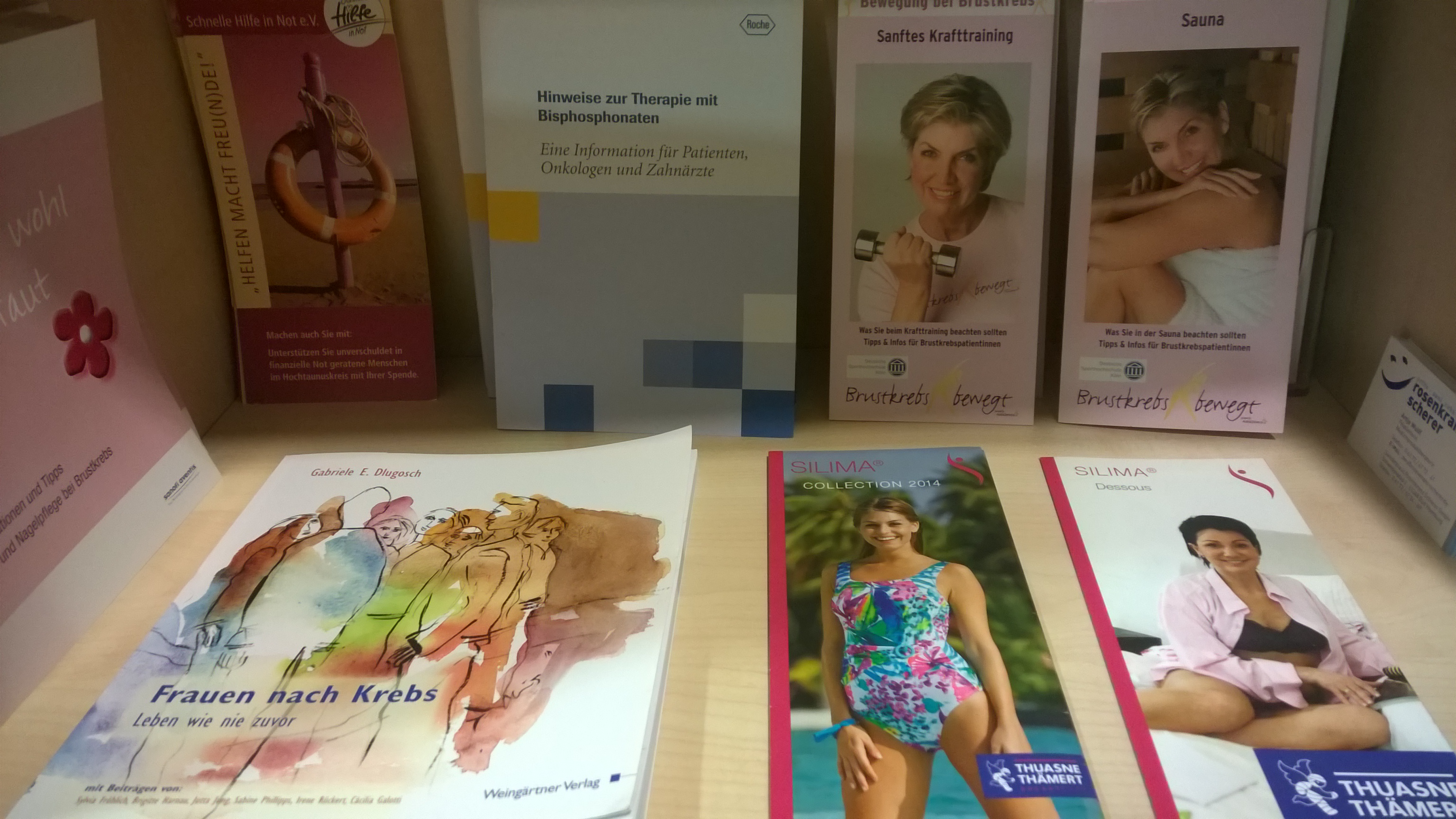 Zu meiner Überraschung saß hinter der Tür zur Onkologie die Frau Dingsbums, die seit Jahren dort die gute Seele der Terminfindung und Abwicklung ist. Also war ich wohl doch richtig. Interessant. Während ich nun im Wartebereich (kleine Ecke auf dem normalen Krankenhausflur) nochmals darüber nachdachte, wie unpassend ich diese Zusammenlegung finde, fällt mein Augenmerk auf das Regal vor mir.